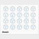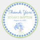 Dulce diseño pegatina de bautismo. Una doble fila de puntos azules y verdes bordea este lindo pegatina. Un pequeño ramo de flores silvestres azules está en el fondo. El texto dice gracias, luego el nombre y el bautismo del niño y la fecha del bautismo. Está en el mismo verde y azul que los puntos. Fácil de personalizar.