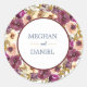 Este encantador pegatina boda de novios y novios cuenta con rosas acuáticos de color burdeos profundo, morado y rosa y crema claro, así como vegetación botánica. Personalízalo con los nombres Bride y Grooms en el centro rodeado por un marco borgoñoso. Usa estos hermosos pegatinas para sellar sobres de invitación a bodas o bolsas de favores de fiesta.