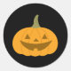 ¡Celebra Halloween con un pegatina feliz y divertido! Esto sería genial para ambas escuelas, bolsos de regalo, fiestas y bolsos de regalo. En cualquier lugar donde se pueda imaginar a un pegatina esto sería genial para. Un simple y feliz jack-o-lantern se coloca sobre un fondo negro. ¡Feliz Halloween!