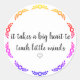 "Se necesita un gran corazón para enseñar a las pequeñas mentes" pegatinas circulares con flor arco iris y mini corazón para los profesores.