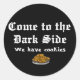 Este pegatina cómico dice 'Ven al lado oscuro - tenemos galletas' en dos tipos elegantes. Justo debajo del texto hay un plato de galletas para ilustrar las galletas que se ofrecen para unirse al lado oscuro.