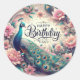 "Haz una declaración con esta impresionante etiqueta de cumpleaños de diseño impresionante. Con un hermoso diseño floral de flores rosadas y un majestuoso pavo real, esta etiqueta es perfecta para tarjetas de cumpleaños, envolturas de regalos y decoraciones de fiestas.