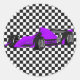 Pegatina de fiesta de cumpleaños divertida o sello para sobres hecho en un patrón de cuadros negros y blancos. Gráficos de un coche de carreras de fórmula púrpura, decora el medio. Personalizar para agregar texto a este pegatina genial. Genial con nuestros chicos invitaciones de cumpleaños para autos de carrera.