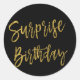 Sorpresa Cumpleaños Negro y Pegatina de Cumpleaños Relieve metalizado dorado. El pegatina de cumpleaños sorpresa utiliza la popular tipografía de Relieve metalizado de oro. Este pegatina se utiliza para sellar los sobres de cumpleaños sorpresa.