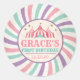 Pegatina de cumpleaños de carnaval rosado, etiqueta de favor de circo rosado y verde azulado