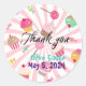 Pegatina personalizada con Gracias. Añadir su propio texto ....nombre de cumpleaños y fecha que se están burlando. El pegatina ofrece pasteles fiestas, caramelos y postres. ¡Ideal para las reposterías y los pasteles!