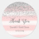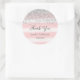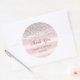 Pegatina redondo para ducha de novia con purpurina de color plateado falso y fondo de rayas rosas.