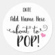 Cerca de los pegatinas de la ducha de bebé POP. Caracteriza la frase "A punto de ser POP" en el color de texto elegido. Puede usar el color para el fondo, la frase, el corazón, el nombre y la fecha