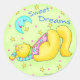 El gato durmiente está haciendo lo que los gatos hacen mejor - dormir la siesta. Este pegatina coordina con el papel y la invitación. Lleva una adorable tapa rosa con estrellas y mangas rayadas de agua. La luna está colgando encima del gatito dormido, mirando con una sonrisa. Kitty también tiene una sonrisa alegre, así que sabes que está teniendo dulces sueños. El texto de "Sweet Dreams" está sobre un fondo verde lima salpicado de estrellas amarillas y puntos rosas. La imagen está encerrada con un colorido borde blanco. Este gatito amarillo es uno de los 10 gatos de la colección de tela "Meow Meow" de Phyllis Dobbs.
