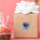 Este globo de aire caliente se llama Heavens Quilt. En este pegatina se muestran colores brillantes azules, rojos, naranjas y amarillos sobre fondo azul cielo.