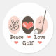 Símbolo de paz, corazón, club de golf y pelota de golf en color rosa y marrón oscuro en el bonito golf para camisetas, ropa y más mercadería de golf y regalos para un verdadero amante del golf.