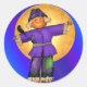 Cute espantapájaros de Halloween y luna llena sobre fondo azul profundo y morado. El cuervo negro descansando sobre su hombro
