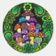 Pegatina con coloridas setas psicodélicas rodeado de paisajes verdes y mandalas verdes.