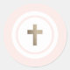 Un pegatina moderno y religioso con una cruz de oro simple que se esconde en círculos blancos y rosas suaves. Ideal para cajas de favores, sobres o regalos. Coordenadas con elementos de la colección clásica de bautismo de franjas de Stacey Meacham.
