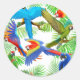 Obra de arte original de la diseñadora Carolyn McFann de coloridos loros de macao de jacinto, azul y oro y macaws híbridos al ejército y escarlata en regalos de calidad, franqueo y tarjetas.