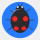 Un pegatina redondo que ofrece una mariquita negra del harlequin con cuatro puntos rojos de forma irregular en su parte posterior, seis piernas y dos puntos blancos que parecen ojos en el frente de su cabeza. Una especie asiática es originalmente ahora de vida y de crianza en Europa y América. Se ha puesto en un fondo azul pero también luce increíble contra otros fondos del color. Usted puede cambiar el color de fondo y otros aspectos del diseño haciendo clic en el modificar para requisitos particulares que abotona.