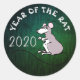 Ilustracion lindo de una rata al estilo de los cómics con 2020 y "Año de la Rata" al personalizar si se quiere con una imagen metálica verde como fondo. Diseño en pegatina redondo. Coincidiendo con la tarjeta de saludo, productos artesanales y más...