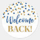 Bienvenidos pegatinas de vuelta con motivos dorados y azul.