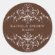 Los adornos antiguos románticos en blanco contra un rico fondo marrón sirven como marco para este pegatina. Personalizar por completo con su(s) nombre(s) y fecha del evento. Póngalo en sobres o correspondencia, precintar bolsas de favoritas, cajas de etiquetas, etc. Un pegatina adecuado para cualquier ocasión: bodas, fiestas de compromiso, un evento de reserva o un evento corporativo. Disponible en colores alternativos con productos coincidentes.