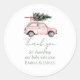 Pegatina redonda festiva con coche rosa de acuarela, árbol de fiestas, muérdago y lazos. Perfecta para sellar sobres, decorar paquetes o detalles de fiestas navideñas.