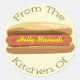 Un pegatina con un ilustracion de un hotdog en un bollo. Personaliza tu nombre en amarillo como mostaza. El texto alrededor del pegatina dice "Desde la cocina de".