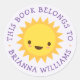Las etiquetas de los libros más bonitas o los pegatinas de las placas de biblioteca con un sol alegre de estilo kawaii sobre un fondo púrpura pálido. Personalizable de texto morado: "Este libro pertenece a" y su nombre personalizado. Ideal para etiquetar libros escolares y tu biblioteca personal o familiar