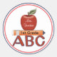 Esta pegatina maestra personalizada tiene un lugar para su nombre y la nota que enseña. Hay círculos en el borde exterior con una manzana, lápiz y ABC.
