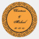 Hasta la muerte Halloween Pegatina redonda. Este espeluznante y moda pegatina boda de Halloween presenta un patrón de damasco negro y naranja para un efecto único. Están disponibles invitaciones coincidentes, tarjetas de respuesta, tarjetas de agradecimiento y favores de boda.