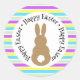 Este diseño se inicia con rayas de colores pastel y cuenta con la silueta de un conejo marrón. El mensaje es "Feliz Pascua".