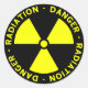 Pegatina negro con símbolo de radiación amarillo y texto de advertencia.