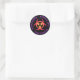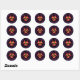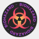 Pegatina negro con símbolo de riesgo biológico multicolor y texto de advertencia morado.