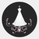 Bonito pegatina sobre blanco y negro, con un vestido de boda blanco sobre un estrado y unas bonitos rosadas en el fondo. Excelentes como focas para los sobres de invitación a la ducha de novia.