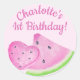 Sella tus invitaciones de cumpleaños de verano o detalles de la fiesta con esta pegatina de sandía jugosa. Con una rebanada en forma de corazón rosa y una cuña de sandía con el texto '1er Cumpleaños', es perfecta para agregar un toque dulce y moderno a la celebración de tu pequeño. ¡Ideal para sobres, bolsas o detalles de la fiesta DIY!