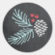 Este pequeño pegatina redondo cuenta con una masa de pino, bayas y pinecona en el fondo de la pizarra. Hace un gran pegatina de cierre o sello para vestir sus sobres esta temporada de vacaciones.
