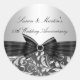 Pegatina del aniversario. Diseño floral plateado y negro con arco de joyas negro. Zazzle exclusivo. Personalizar con sus propios detalles. POR FAVOR, NOTE todas las imágenes planas! ¡¡NO tienen cerdas, diamantes ni joyas!!