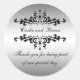 Elegante, personalizado, plata y negro 25 años Boda favorecen a los Pegatinas redondos. Disponible en www.zazzle.com/MonogramLogos. Hermosa plata metálica (efecto foto impreso) con un diseño de remolinos decorativos negros con espacio para los nombres de la pareja casada (novia y novio). Utilícelo para etiquetar sus bolsos de regalo o cajas de favores. Los campos de plantilla permiten dos líneas de texto, incluido un mensaje de agradecimiento al boda. Para más opciones de edición, utilice la opción "personalizar it" para cambiar colores y estilos de fuente.