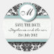 Pegatina de boda de monograma de damasco negro y azul que puede utilizarse como sello de invitación.