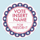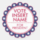Ya sea que estés haciendo campaña para liderar el país, tu ciudad, tu escuela, tu trabajo o apoyando independientemente a tu candidato favorito, estos pegatinas harán que tu mensaje sea notorio. Personalizar fácilmente a estos pegatinas de primera ronda con su propio nombre y título o mensaje. Los pegatinas más pequeños pueden utilizarse como sellos para sus campañas de correo. Este diseño presenta colores rojos, blancos y azules con estrellas blancas. (Sugerencia: Para un título de candidato de dos palabras como "vicepresidente", puede cambiar la palabra "por" a "vicepresidente".) Estos son pegatinas profesionales resistentes a los arañazos impresos en papel sin ácido. Disponible en acabado brillante o mate en tamaño de 3 pulgadas y 1,5 pulgadas. Baja cantidad mínima de pedido y sin cargo de instalación.