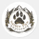 Insignia circular de época con una audaz huella de pata con picos de montaña y pinos en el interior. Perfecto para excursionistas, campistas, amantes de los perros y exploradores al aire libre. Pegatina de vinilo duradero, impermeable e ideal para laptops, botellas de agua y equipo de viaje.