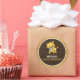 Elegantes pegatinas de favores con un adorable cachorro con una vibrante tipografía sobre un fondo marrón oscuro y purpurina de oro falso.