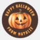 Añade un toque de encanto personal a tus tratamientos de Halloween con nuestro Pegatina de Halloween con calabaza sonriente personalizada. Este bonito pegatina redondo cuenta con un ilustracion acuático de una alegre calabaza tallada, que irradia el espíritu festivo. El pegatina se personaliza con dos líneas de texto personalizado, formando medio círculo alrededor de la calabaza. La parte superior dice "Feliz Halloween", mientras que la parte inferior, inicialmente "de Natalie", se puede reemplazar fácilmente con cualquier nombre o mensaje. Perfecto para niños que comparten tratamientos con amigos o familias que difunden alegría por sus vacaciones.