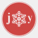 Sello adhesivo redondo de Navidad realizado en rojo festivo con texto blanco que dice alegría donde la o es un copo de nieve blanco. Un gran toque final para sus envíos de vacaciones y golosinas.