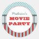 Pegatina coincidente por nuestra divertida invitación de la noche de la película de cumpleaños. Banda de tambor de película a través del medio, con texto en rojo y todo con divertido punto de polka blanco y patrones rayados rojos en un fondo azul verde azulado.