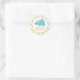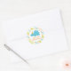 Este lindo pegatina de dinosaurios tiene un fondo de rayas naranjas, verdes y azules. En el medio, hay un círculo con un dinosaurio azul con un gorra fiesta en la cabeza. Debajo del dino, puede personalizar fácilmente el texto.