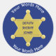 Este Pegatina Personalizado de la insignia Gold Star está decorado con una insignia sheriff que puede ser personalizada de seis maneras, con una elección de palabras arriba y abajo que le permite personalizarla con el nombre de una ciudad, departamento del sheriff, nombres, etc.