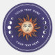 Pegatina de Personalizados místicos del Sol con un diseño místico inspirado en la astrología, los elementos esotéricos, ocultos y misteriosos. Este diseño tiene tonos azules, morados y naranjas, un fondo estrellado, un sol con una cara y fases lunares. Incluye una plantilla para personalización personal.