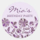 Este moderno pegatina de cumpleaños de personalizable cuenta con flores moradas en un suave fondo violeta. Personalizar añadiendo tus detalles en la letra de tu elección!
