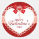 Hermoso y elegante pegatina redondo El día de San Valentín con un florido corazón fronterizo, arco rojo sentado sobre un fondo profundo de corazones rojos. Es magnífico y perfecto para uso personal o de negocios. Además, vea nuestra tarjeta de felicitación correspondiente en nuestra sección Tarjetas El día de San Valentín.