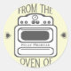 Un pegatina agradable y funcional con una estufa retro de blanco reseñada en gris sobre un fondo blanco roto. El texto gris de arriba y abajo dice "Desde el horno de". Personaliza tu nombre en la estufa. corazones grises a cada lado.