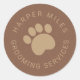 Pegatina rústico con una huella de una pata de perro marrón en una imagen de papel marrón, y con el texto personalizado que rodea. Tenga en cuenta que el cambio de texto puede afectar al radio, ir al personalizar y hacer los cambios necesarios. Adecuado para pequeñas empresas, criadores de perros, veterinarios, paseantes de perros, cuidados diurnos de perros.